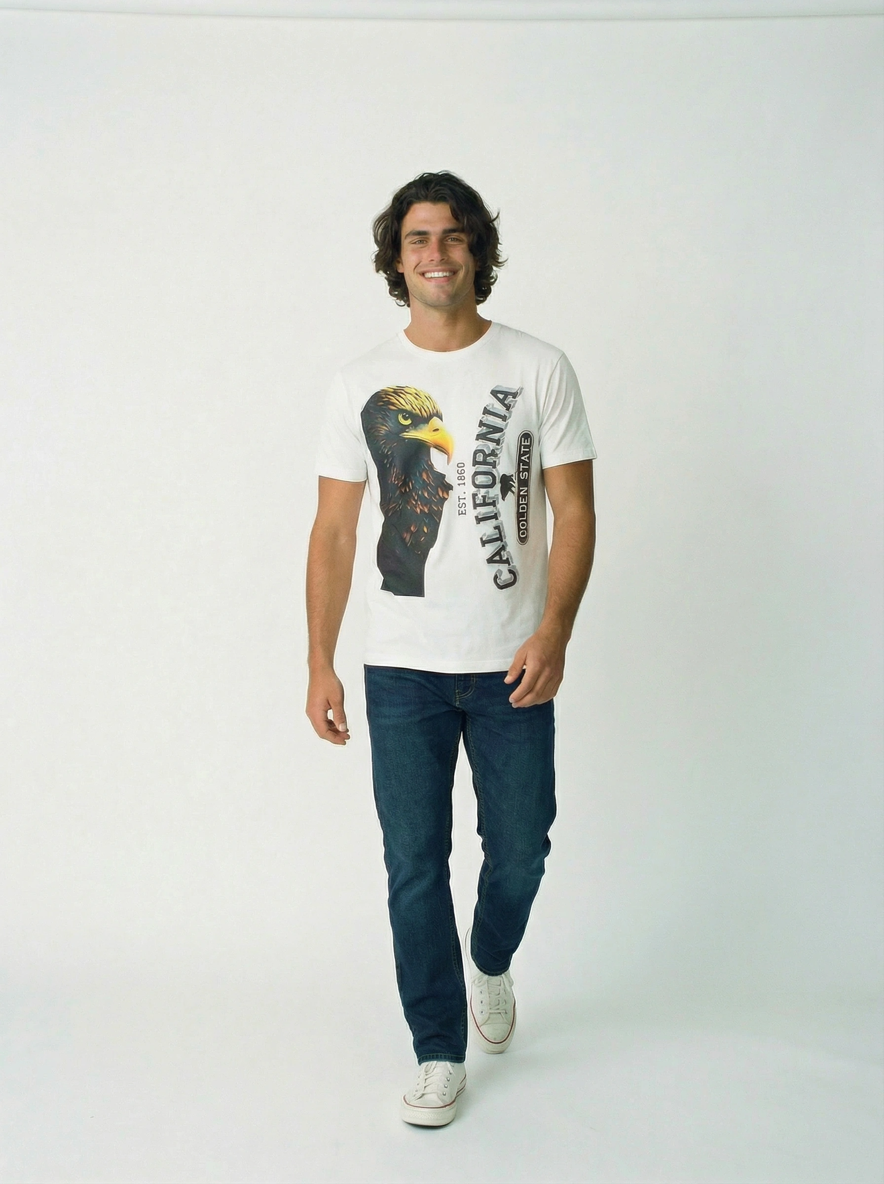 + Free Shipping| Eagle California printed T-shirt Round Neck, Regular Fit Short, drop-shoulder sleeves Soft breathable and stretchable fabric Suitable for casual wear |